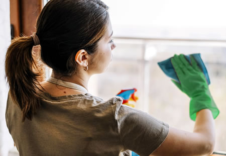 Wiping and sanitizing countertops, cabinets, backsplashes, and appliances